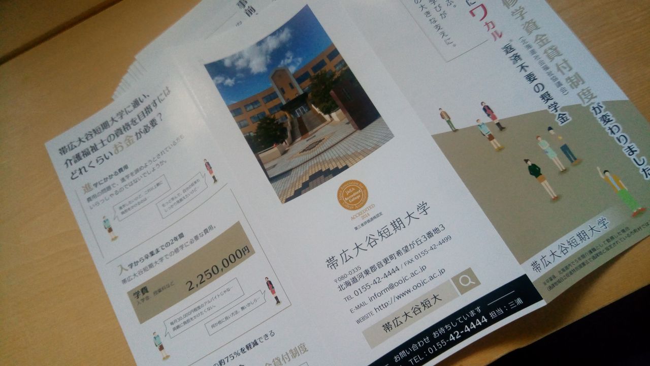 帯広大谷短期大学さま、奨学金紹介の三つ折りパンフレット制作させて頂きました。